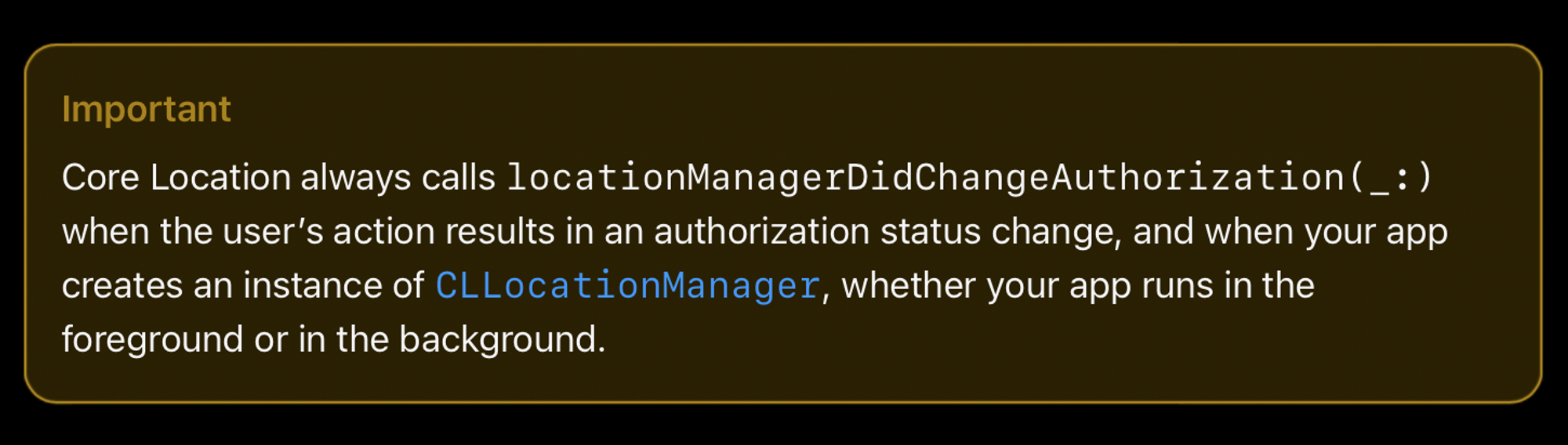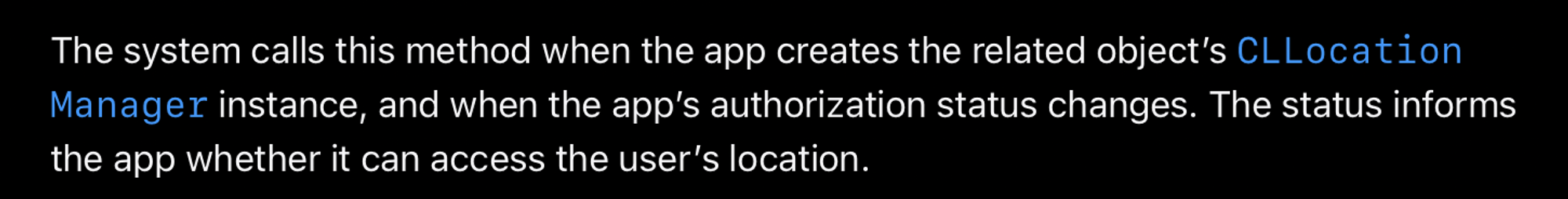 Assign the delegate immediately when you configure your location manager, because the system reports the app’s authorization status to the delegate’s locationManagerDidChangeAuthorization(_:) method after the location manager finishes initializing itself. Core Location calls the methods of your delegate object using the RunLoop of the thread on which you initialized the CLLocationManager object. That thread must itself have an active RunLoop, like the one found in your app’s main thread.