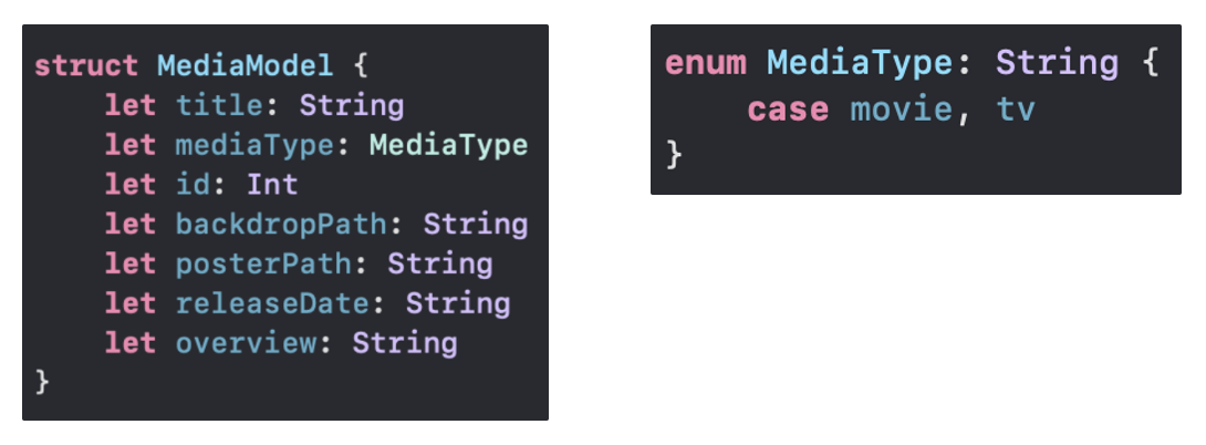 ์ผ๋จ MediaType(rawValue:) ๋ฉ์๋๋ฅผ ์ฌ์ฉํ์ง ์๊ณ mediaType์ ์ง์ .movie๋ .tv๋ก ์ง์ ํ๋ ๋ฐฉ๋ฒ์ผ๋ก ๊ตฌํํ๋ค.