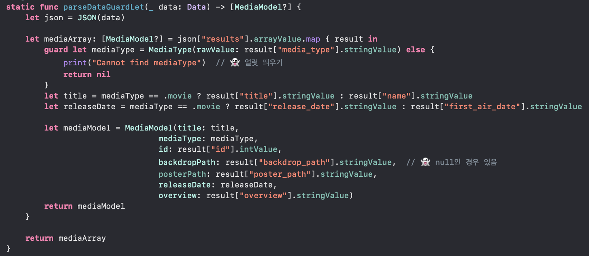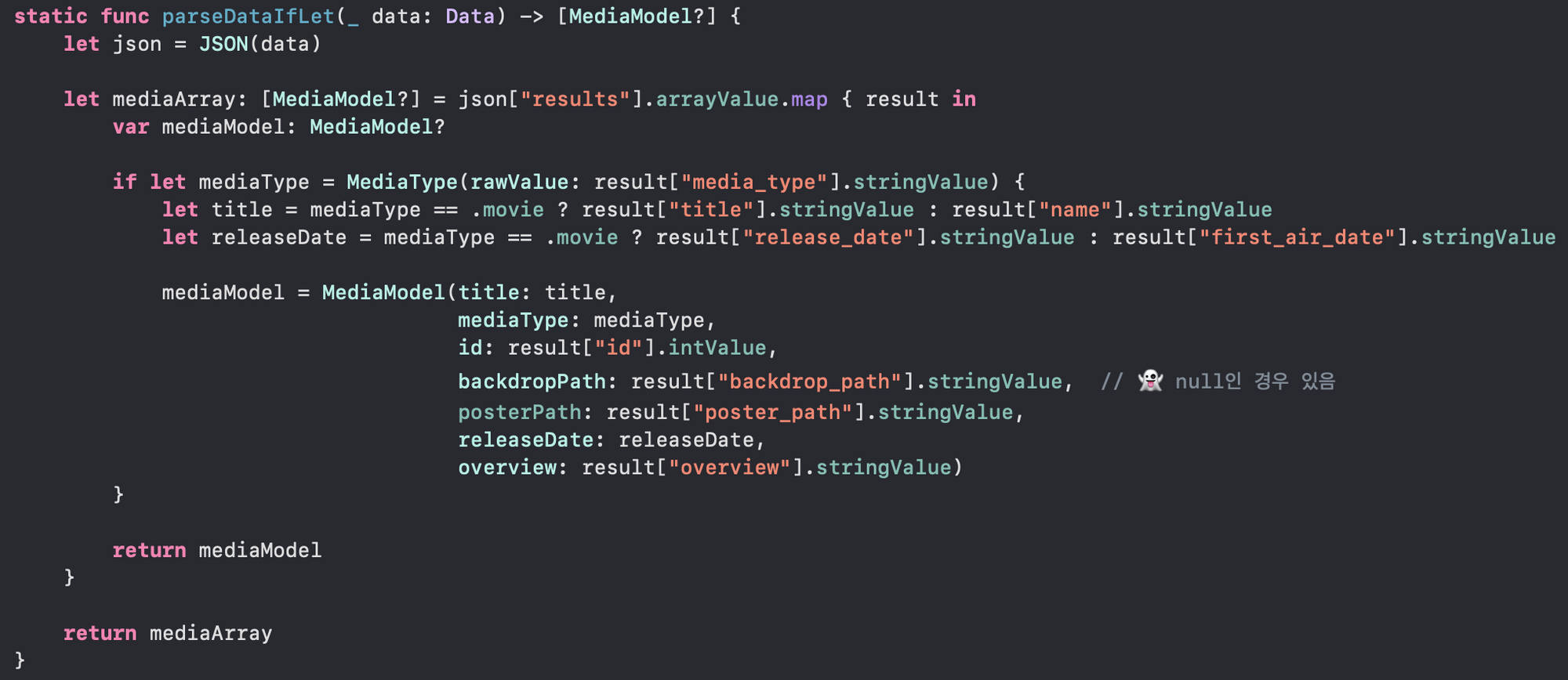 if let ๊ตฌ๋ฌธ์ ์ฌ์ฉํ์ ๋ ๋ชจ๋ MediaModel? ๋ฐฐ์ด๋ก๋ง ๊ตฌํ์ด ๊ฐ๋ฅํ๋ค.