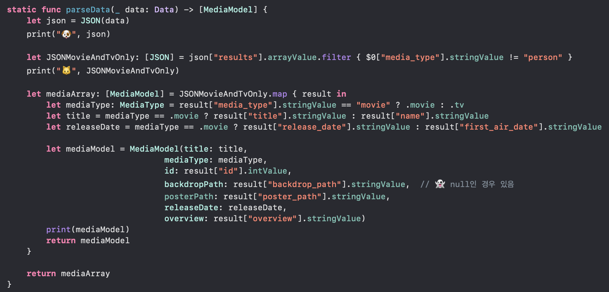 ๋ชจ๋ธ ๋ด mediaType์ ํ์ ์ Enumeration์ผ๋ก ์ง์ ํ์ ๋, data parsing ์ MediaType(rawValue:) ๋ฉ์๋๋ฅผ ์ฌ์ฉํ๋ ค๊ณ ํ์ ๋์ ์ด์(?)