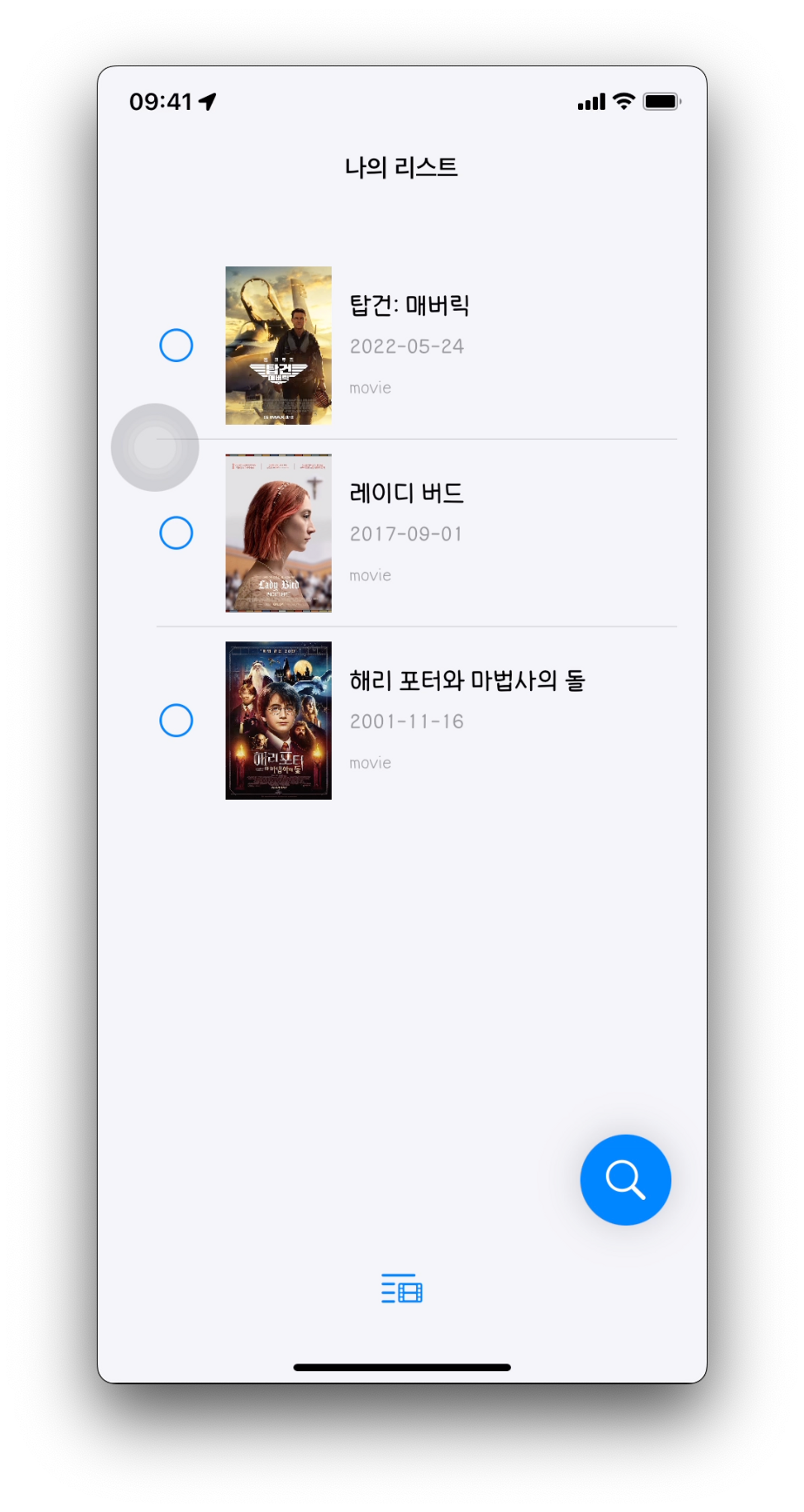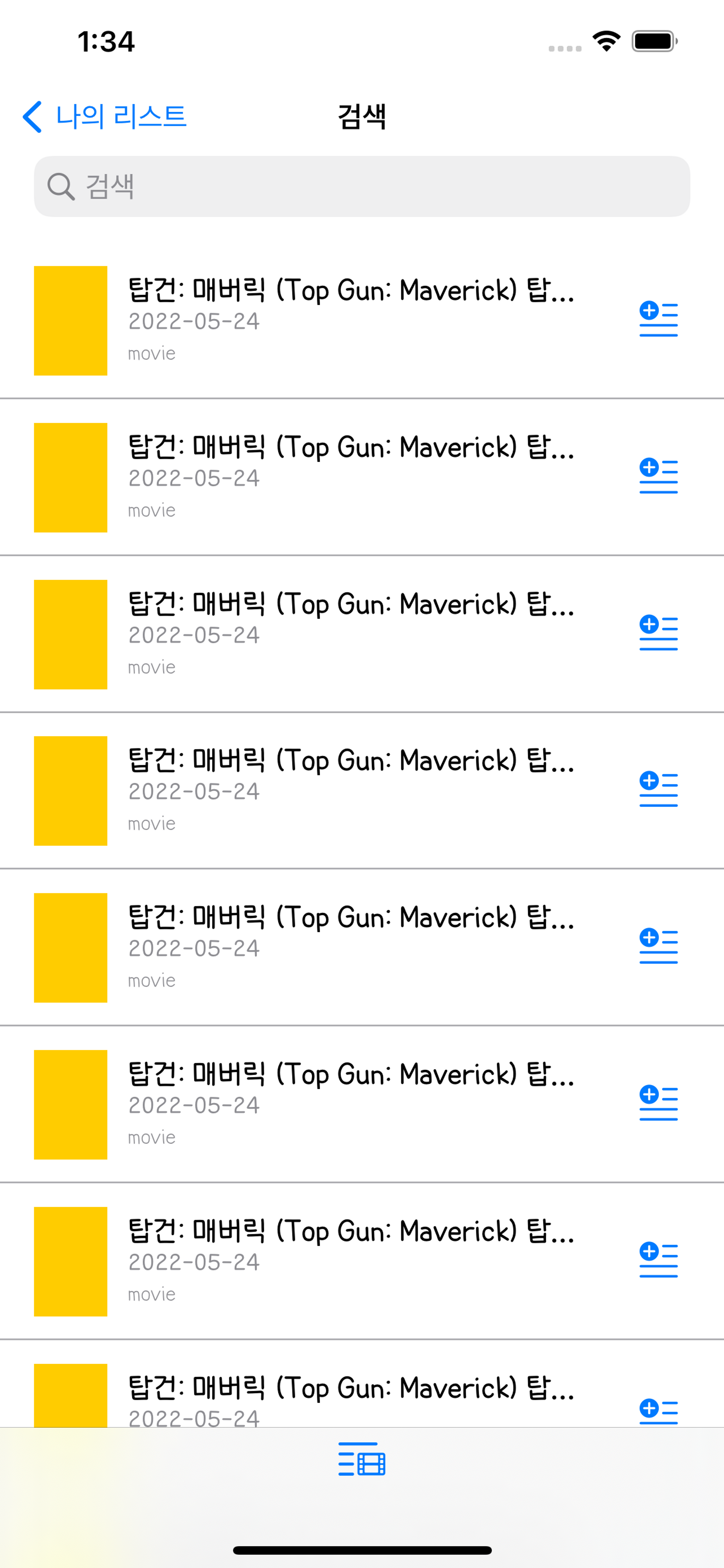우선 구현한 검색 화면은 아래와 같다. 탭 바의 이미지가 상단에 붙어있는 것 같아 보이는 것을 알 수 있다.