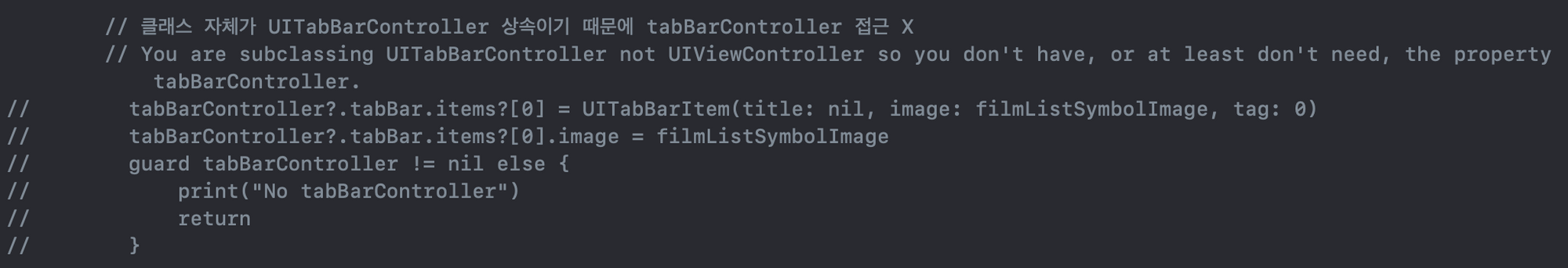 tabBar 프로퍼티에 접근 시 tabBarController?에 접근하지 않고 바로 tabBar 프로퍼티에 접근하면 된다.